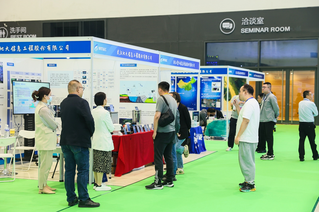在A4展区,地大信息工作人员向参会领导、行业专家、参展企业介绍了视频GNSS一体机、视频水位计、智慧站、水质监测等设备,中小水库大坝安全监测、数字孪生防洪“四预”平台、灌区信息化等解决方案,展现了产品的核心能力和技术优势,吸引与会嘉宾驻足观看与咨询洽谈。
