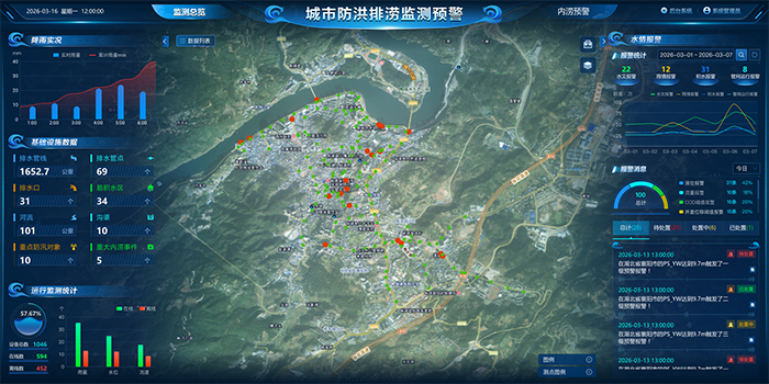 依托物联网、二三维GIS平台、数据中台与AI平台,集成降雨、排水管网、DEM、土地利用、监测设备数据等多源数据,构建区域城市内涝模拟模型,进行24小时循环计算与预警信息生成,预测内涝积水范围、深度及管网溢流等指标,为城市防洪提供精准决策支持。